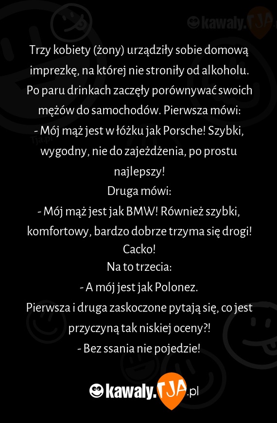 Trzy kobiety (żony) urządziły sobie domową imprezkę, na której nie stroniły od alkoholu. Po paru drinkach zaczęły porównywać swoich mężów do samochodów. Pierwsza mówi: