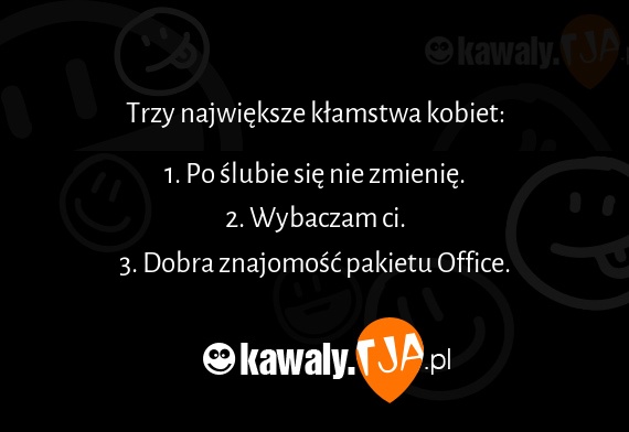 Trzy najwieksze klamstwa kobiet: 1. Po slubie sie nie zmienie. 2. Wybaczam ci. 3. Dobra znajomosc pakietu Office.