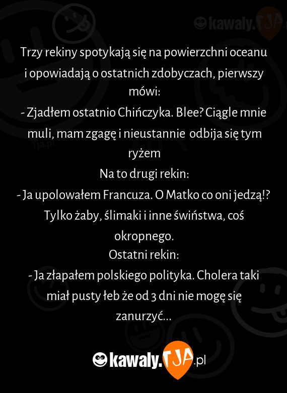 Trzy rekiny spotykają się na powierzchni oceanu i opowiadają o ostatnich zdobyczach, pierwszy mówi:
