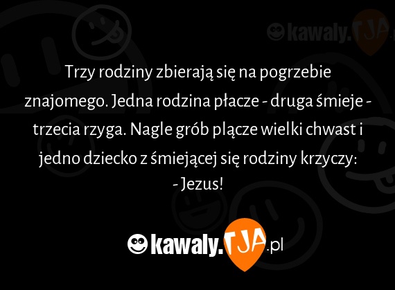 Trzy rodziny zbieraja sie na pogrzebie znajomego. Jedna rodzina placze - druga smieje - trzecia rzyga. Nagle grob placze wielki chwast i jedno dziecko z smiejacej sie rodziny krzyczy: - Jezus!