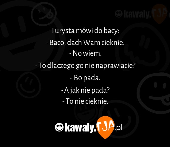 Turysta mowi do bacy: - Baco, dach Wam cieknie. - No wiem. - To dlaczego go nie naprawiacie? - Bo pada. - A jak nie pada? - To nie cieknie.