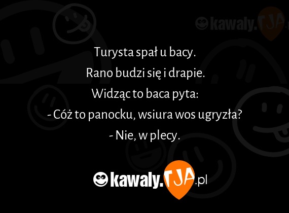 Turysta spal u bacy. Rano budzi sie i drapie. Widzac to baca pyta: - Coz to panocku, wsiura wos ugryzla? - Nie, w plecy.