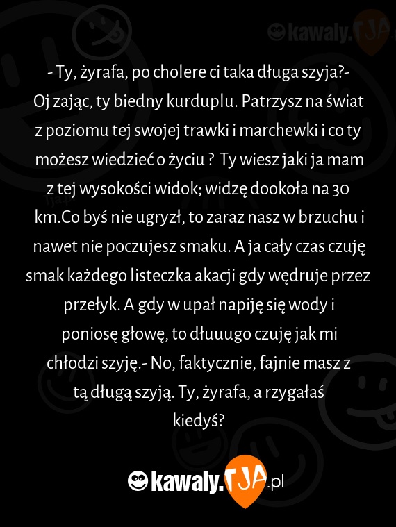 - Ty, żyrafa, po cholere ci taka długa szyja?- Oj zając, ty biedny kurduplu. Patrzysz na świat z poziomu tej swojej trawki i marchewki i co ty możesz wiedzieć o życiu ? Ty wiesz jaki ja mam z tej wysokości widok; widzę dookoła na 30 km.Co byś nie ugryzł, to zaraz nasz w brzuchu i nawet nie poczujesz smaku. A ja cały czas czuję smak każdego listeczka akacji gdy wędruje przez przełyk. A gdy w upał napiję się wody i poniosę głowę, to dłuuugo czuję jak mi chłodzi szyję.- No, faktycznie, fajnie masz z tą długą szyją. Ty, żyrafa, a rzygałaś kiedyś?
