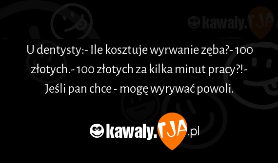 U dentysty:- Ile kosztuje wyrwanie zeba?- 100 zlotych.- 100 zlotych za kilka minut pracy?!- Jesli pan chce - moge wyrywac powoli.