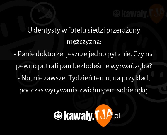 U dentysty w fotelu siedzi przerażony mężczyzna: - Panie doktorze, jeszcze jedno pytanie. Czy na pewno potrafi pan bezboleśnie wyrwać zęba? - No, nie zawsze. Tydzień temu, na przykład, podczas wyrywania zwichnąłem sobie rękę.