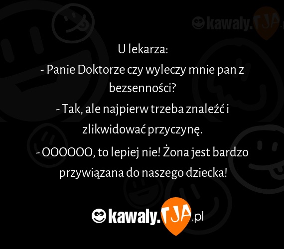 U lekarza: - Panie Doktorze czy wyleczy mnie pan z bezsenności? - Tak, ale najpierw trzeba znaleźć i zlikwidować przyczynę. - OOOOOO, to lepiej nie! Żona jest bardzo przywiązana do naszego dziecka!