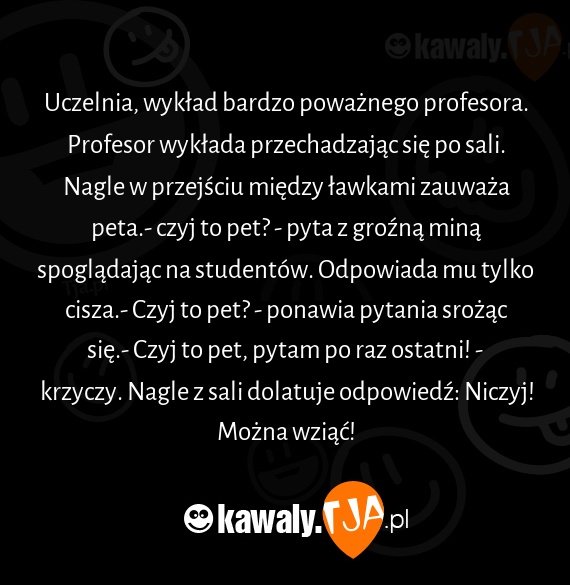 Uczelnia, wykład bardzo poważnego profesora. Profesor wykłada przechadzając się po sali. Nagle w przejściu między ławkami zauważa peta.- czyj to pet? - pyta z groźną miną spoglądając na studentów. Odpowiada mu tylko cisza.- Czyj to pet? - ponawia pytania srożąc się.- Czyj to pet, pytam po raz ostatni! - krzyczy. Nagle z sali dolatuje odpowiedź: Niczyj! Można wziąć!
