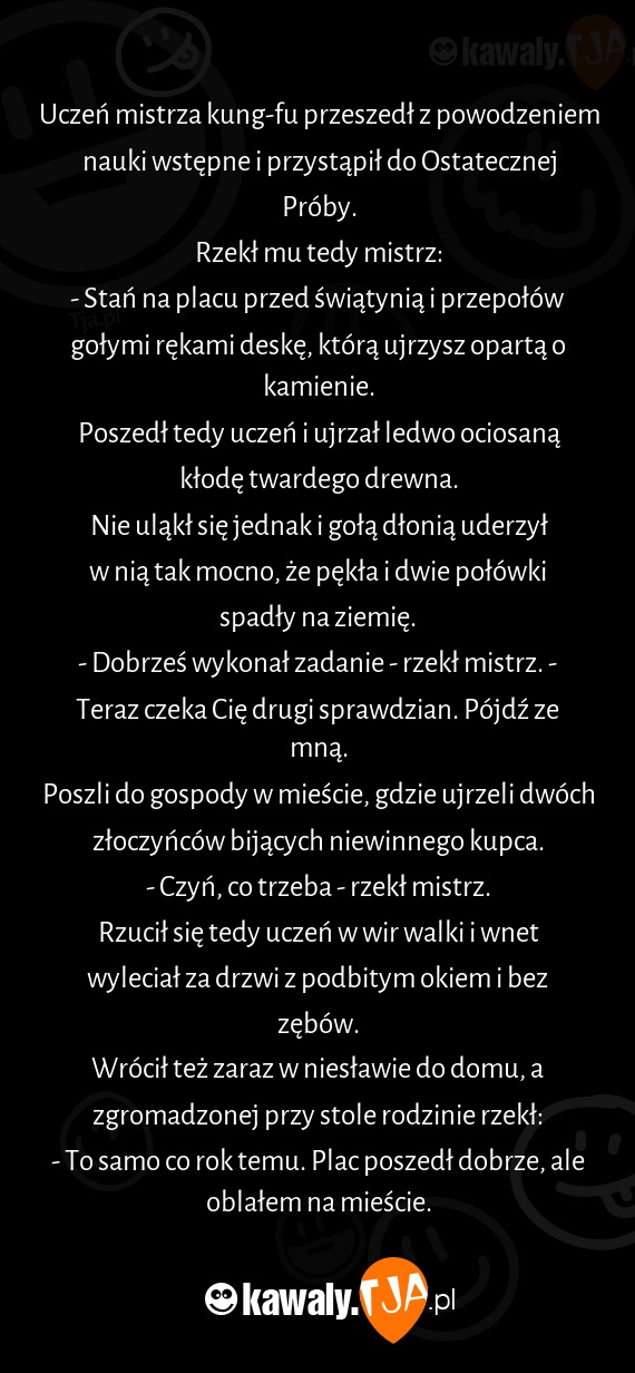 Uczeń mistrza kung-fu przeszedł z powodzeniem nauki wstępne i przystąpił do Ostatecznej Próby.