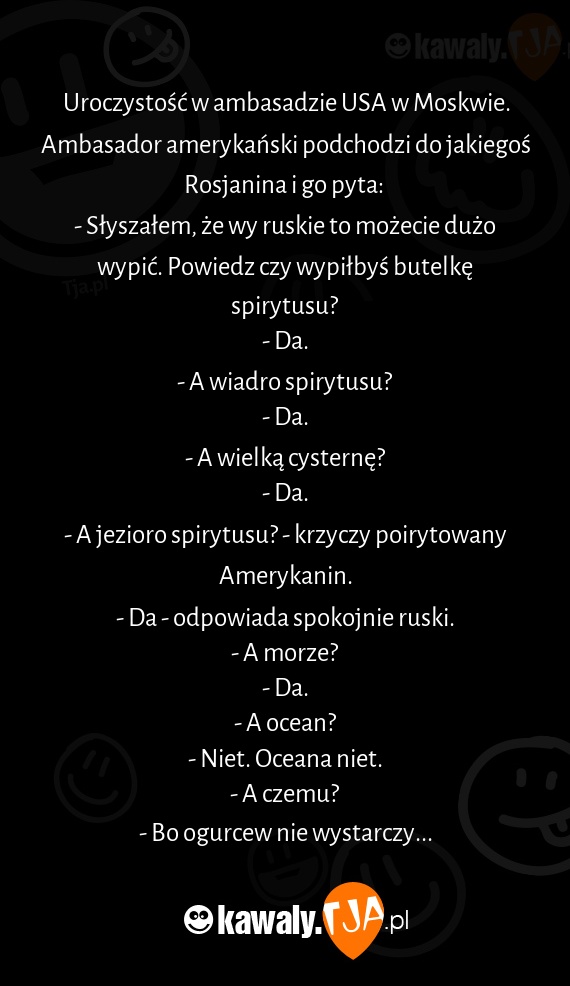 - Słyszałem, że wy ruskie to możecie dużo wypić. Powiedz czy wypiłbyś butelkę spirytusu?