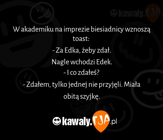 W akademiku na imprezie biesiadnicy wznosza toast: - Za Edka, zeby zdal. Nagle wchodzi Edek. - I co zdales? - Zdalem, tylko jednej nie przyjeli. Miala obita szyjke.