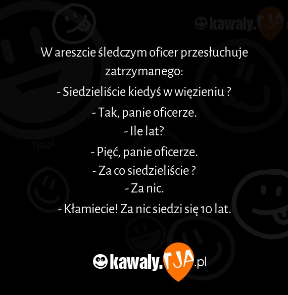W areszcie śledczym oficer przesłuchuje zatrzymanego: - Siedzieliście kiedyś w więzieniu ? - Tak, panie oficerze. - Ile lat? - Pięć, panie oficerze. - Za co siedzieliście ? - Za nic. - Kłamiecie! Za nic siedzi się 10 lat.