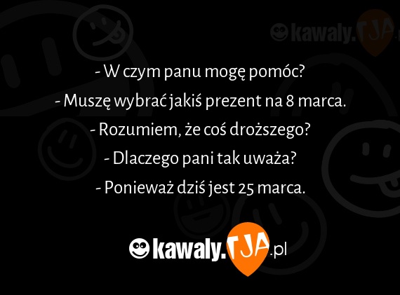 - W czym panu moge pomoc? - Musze wybrac jakis prezent na 8 marca. - Rozumiem, ze cos drozszego? - Dlaczego pani tak uwaza? - Poniewaz dzis jest 25 marca.