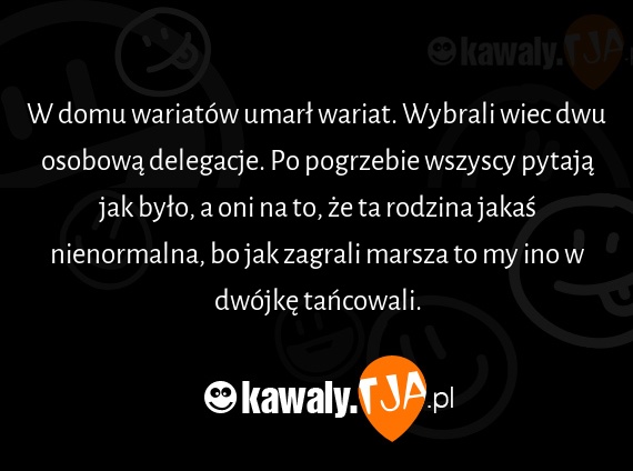 W domu wariatow umarl wariat. Wybrali wiec dwu osobowa delegacje. Po pogrzebie wszyscy pytaja jak bylo, a oni na to, ze ta rodzina jakas nienormalna, bo jak zagrali marsza to my ino w dwojke tancowali.