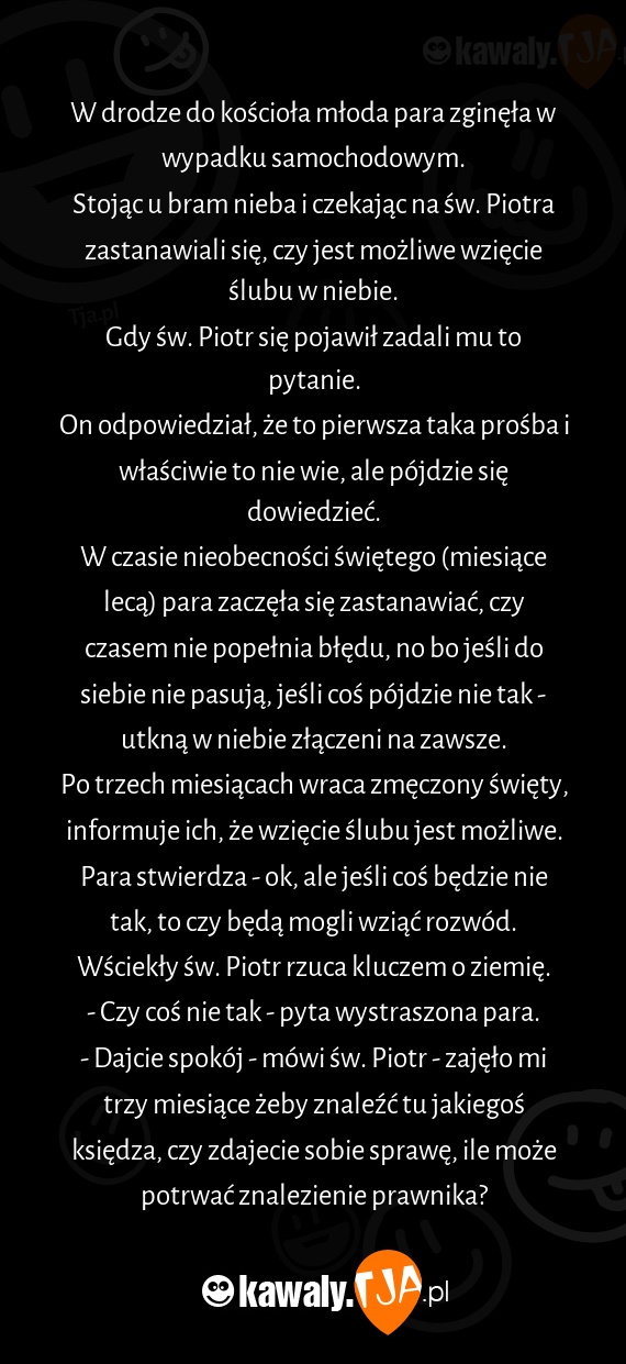 - Dajcie spokój - mówi św. Piotr - zajęło mi trzy miesiące żeby znaleźć tu jakiegoś księdza, czy zdajecie sobie sprawę, ile może potrwać znalezienie prawnika?