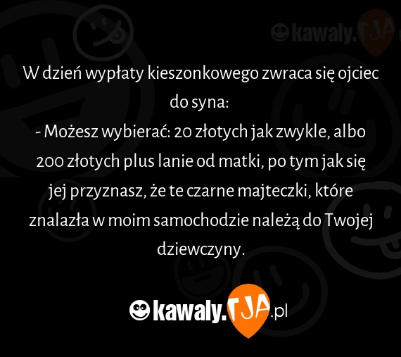 - Możesz wybierać: 20 złotych jak zwykle, albo 200 złotych plus lanie od matki, po tym jak się jej przyznasz, że te czarne majteczki, które znalazła w moim samochodzie należą do Twojej dziewczyny.