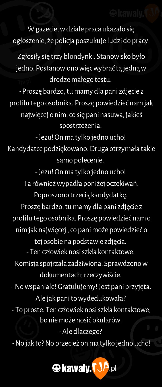 Zgłosiły się trzy blondynki. Stanowisko było jedno. Postanowiono więc wybrać tą jedną w drodze małego testu.