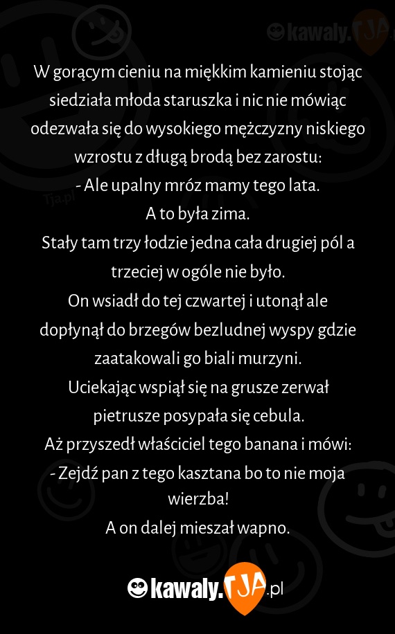 W gorącym cieniu na miękkim kamieniu stojąc siedziała młoda staruszka i nic nie mówiąc odezwała się do wysokiego mężczyzny niskiego wzrostu z długą brodą bez zarostu: