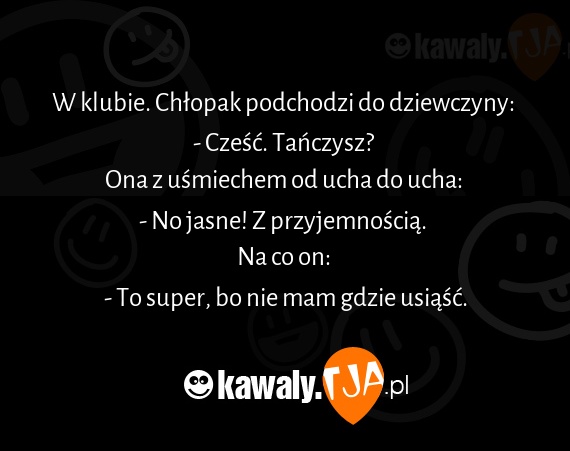 W klubie. Chłopak podchodzi do dziewczyny: - Cześć. Tańczysz? Ona z uśmiechem od ucha do ucha: - No jasne! Z przyjemnością. Na co on: - To super, bo nie mam gdzie usiąść.