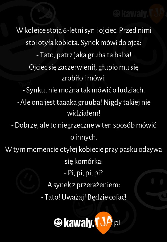 W kolejce stoją 6-letni syn i ojciec. Przed nimi stoi otyła kobieta. Synek mówi do ojca:
