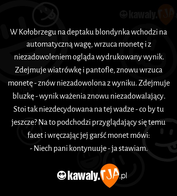 W Kołobrzegu na deptaku blondynka wchodzi na automatyczną wagę, wrzuca monetę i z niezadowoleniem ogląda wydrukowany wynik. Zdejmuje wiatrówkę i pantofle, znowu wrzuca monetę - znów niezadowolona z wyniku. Zdejmuje bluzkę - wynik ważenia znowu niezadowalający. Stoi tak niezdecydowana na tej wadze - co by tu jeszcze? Na to podchodzi przyglądający się temu facet i wręczając jej garść monet mówi: