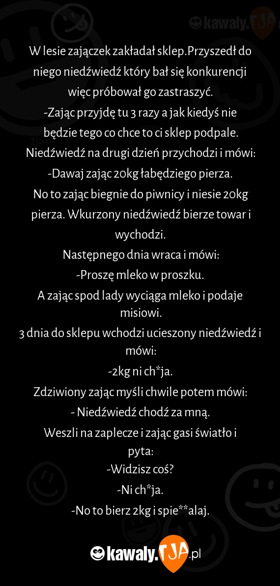 No to zając biegnie do piwnicy i niesie 20kg pierza. Wkurzony niedźwiedź bierze towar i wychodzi.
