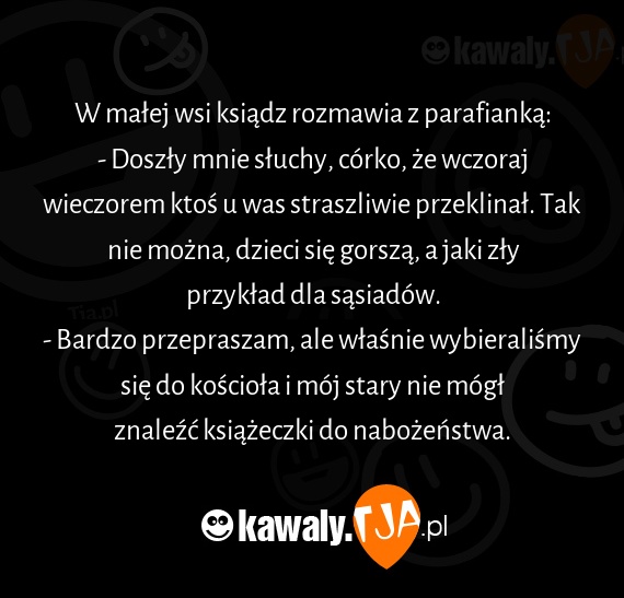 - Bardzo przepraszam, ale właśnie wybieraliśmy się do kościoła i mój stary nie mógł znaleźć książeczki do nabożeństwa.
