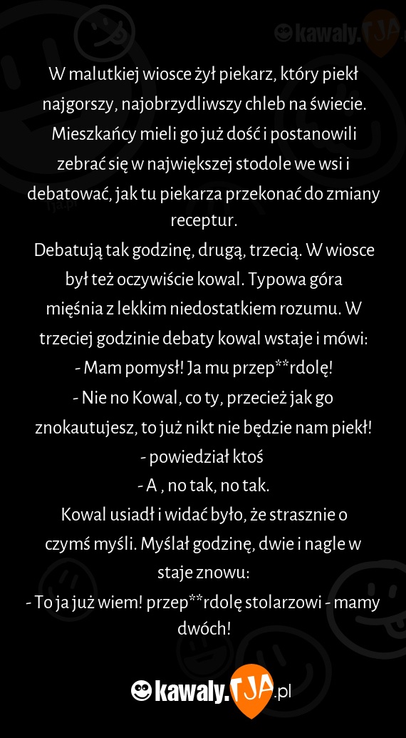 Debatują tak godzinę, drugą, trzecią. W wiosce był też oczywiście kowal. Typowa góra mięśnia z lekkim niedostatkiem rozumu. W trzeciej godzinie debaty kowal wstaje i mówi: