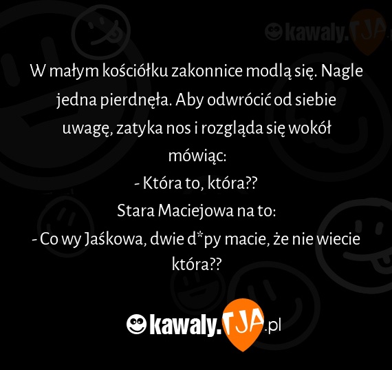 W małym kościółku zakonnice modlą się. Nagle jedna pierdnęła. Aby odwrócić od siebie uwagę, zatyka nos i rozgląda się wokół mówiąc: