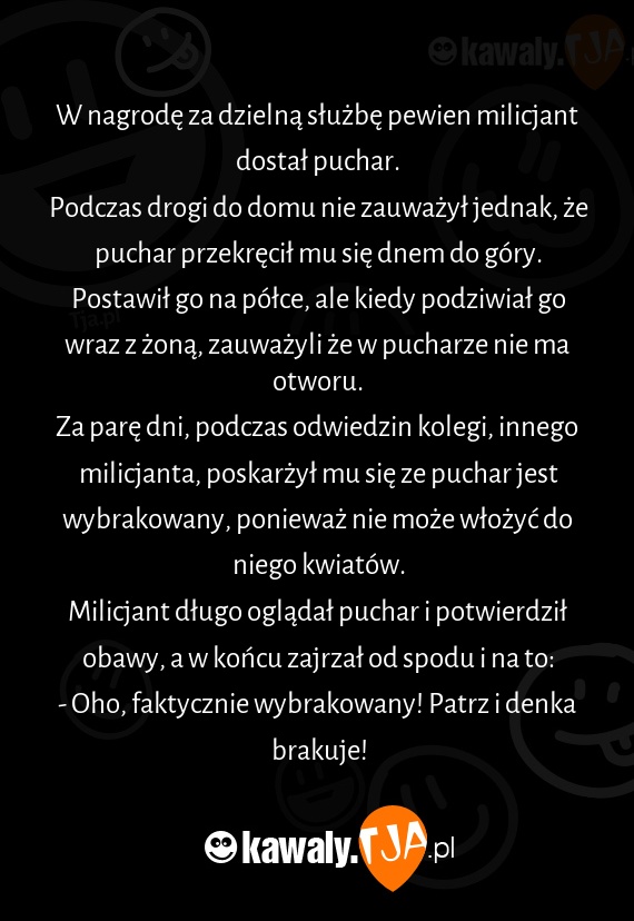 Za parę dni, podczas odwiedzin kolegi, innego milicjanta, poskarżył mu się ze puchar jest wybrakowany, ponieważ nie może włożyć do niego kwiatów.