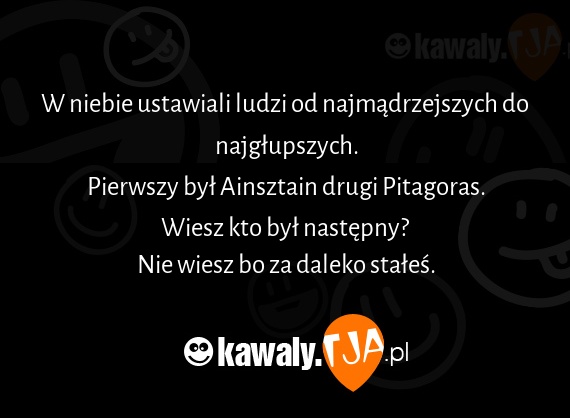 W niebie ustawiali ludzi od najmadrzejszych do najglupszych. Pierwszy byl Ainsztain drugi Pitagoras. Wiesz kto byl nastepny? Nie wiesz bo za daleko stales.