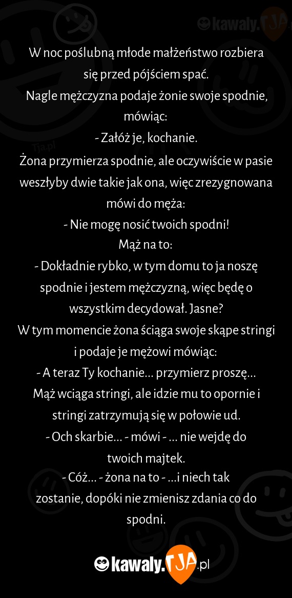 - Cóż... - żona na to - ...i niech tak zostanie, dopóki nie zmienisz zdania co do spodni.