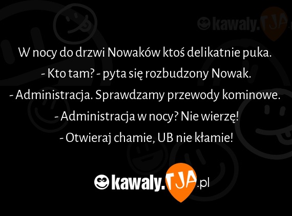 W nocy do drzwi Nowaków ktoś delikatnie puka. - Kto tam? - pyta się rozbudzony Nowak. - Administracja. Sprawdzamy przewody kominowe. - Administracja w nocy? Nie wierzę! - Otwieraj chamie, UB nie kłamie!