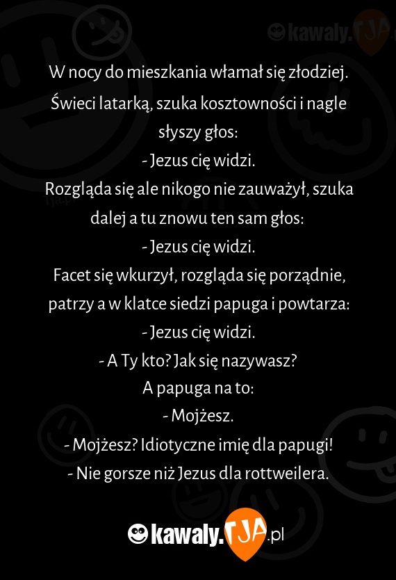 Facet się wkurzył, rozgląda się porządnie, patrzy a w klatce siedzi papuga i powtarza: