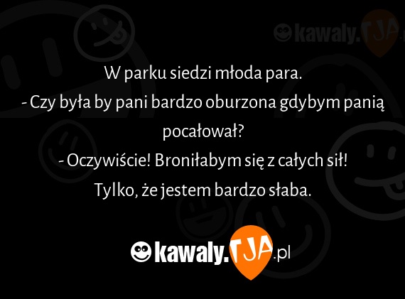 W parku siedzi mloda para. - Czy byla by pani bardzo oburzona gdybym pania pocalowal? - Oczywiscie! Bronilabym sie z calych sil! Tylko, ze jestem bardzo slaba.