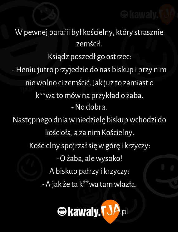 - Heniu jutro przyjedzie do nas biskup i przy nim nie wolno ci zemścić. Jak już to zamiast o k**wa to mów na przykład o żaba.