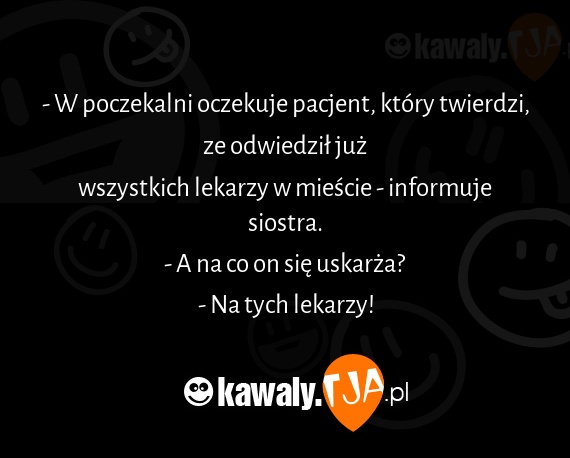 - W poczekalni oczekuje pacjent, ktory twierdzi, ze odwiedzil juz wszystkich lekarzy w miescie - informuje siostra. - A na co on sie uskarza? - Na tych lekarzy!