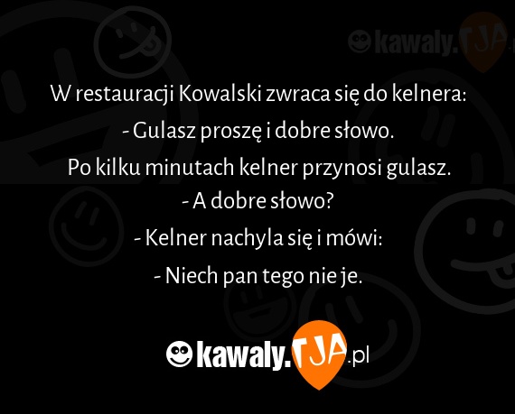 W restauracji Kowalski zwraca się do kelnera: - Gulasz proszę i dobre słowo. Po kilku minutach kelner przynosi gulasz. - A dobre słowo? - Kelner nachyla się i mówi: - Niech pan tego nie je.
