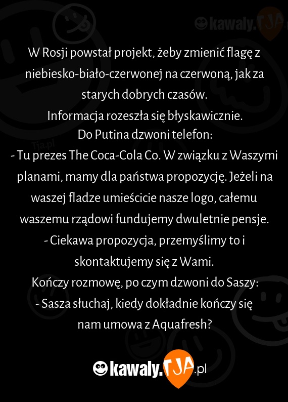 - Tu prezes The Coca-Cola Co. W związku z Waszymi planami, mamy dla państwa propozycję. Jeżeli na waszej fladze umieścicie nasze logo, całemu waszemu rządowi fundujemy dwuletnie pensje.
