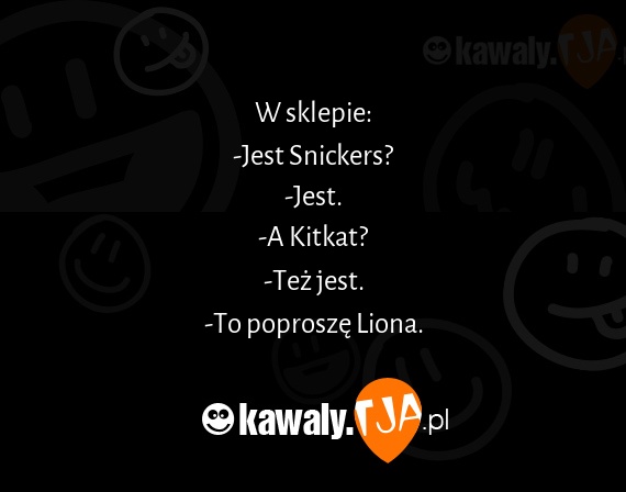 W sklepie: -Jest Snickers? -Jest. -A Kitkat? -Tez jest. -To poprosze Liona.