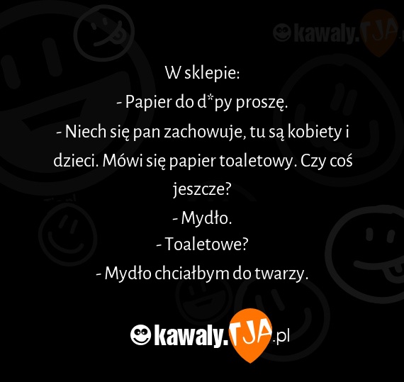 W sklepie: - Papier do d*py prosze. - Niech sie pan zachowuje, tu sa kobiety i dzieci. Mowi sie papier toaletowy. Czy cos jeszcze? - Mydlo. - Toaletowe? - Mydlo chcialbym do twarzy.