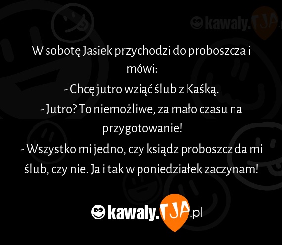 W sobotę Jasiek przychodzi do proboszcza i mówi: - Chcę jutro wziąć ślub z Kaśką. - Jutro? To niemożliwe, za mało czasu na przygotowanie! - Wszystko mi jedno, czy ksiądz proboszcz da mi ślub, czy nie. Ja i tak w poniedziałek zaczynam!