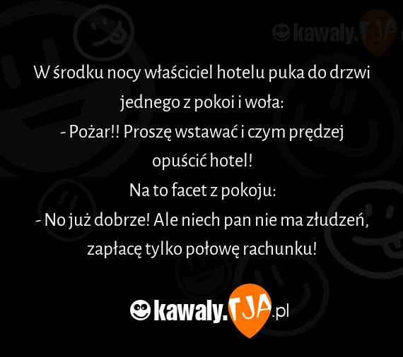 W środku nocy właściciel hotelu puka do drzwi jednego z pokoi i woła: - Pożar!! Proszę wstawać i czym prędzej opuścić hotel! Na to facet z pokoju: - No już dobrze! Ale niech pan nie ma złudzeń, zapłacę tylko połowę rachunku!
