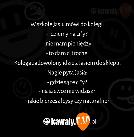 W szkole Jasiu mowi do kolegi: - idziemy na ci*y? - nie mam pieniedzy - to dam ci troche Kolega zadowolony idzie z Jasiem do sklepu. Nagle pyta Jasia: - gdzie sa te ci*y? - na szewce nie widzisz? - jakie bierzesz leysy czy naturalne?