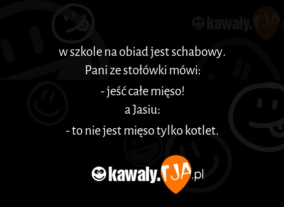 w szkole na obiad jest schabowy. Pani ze stołówki mówi: - jeść całe mięso! a Jasiu: - to nie jest mięso tylko kotlet.