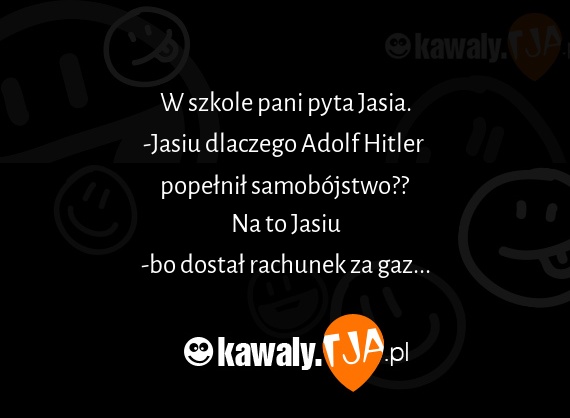 W szkole pani pyta Jasia. -Jasiu dlaczego Adolf Hitler popelnil samobojstwo?? Na to Jasiu -bo dostal rachunek za gaz...