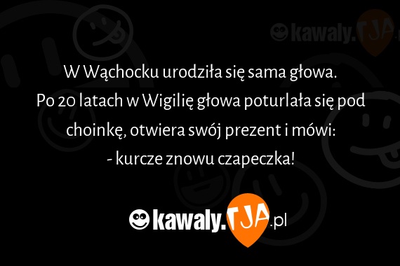 W Wachocku urodzila sie sama glowa. Po 20 latach w Wigilie glowa poturlala sie pod choinke, otwiera swoj prezent i mowi: - kurcze znowu czapeczka!