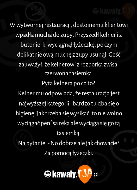 W wytwornej restauracji, dostojnemu klientowi wpadła mucha do zupy. Przyszedł kelner i z butonierki wyciągnął łyżeczkę, po czym delikatnie ową muchę z zupy usunął. Gość zauważył, że kelnerowi z rozporka zwisa czerwona tasiemka.
