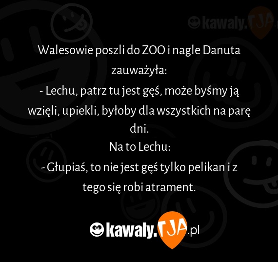 Walesowie poszli do ZOO i nagle Danuta zauważyła: - Lechu, patrz tu jest gęś, może byśmy ją wzięli, upiekli, byłoby dla wszystkich na parę dni. Na to Lechu: - Głupiaś, to nie jest gęś tylko pelikan i z tego się robi atrament.
