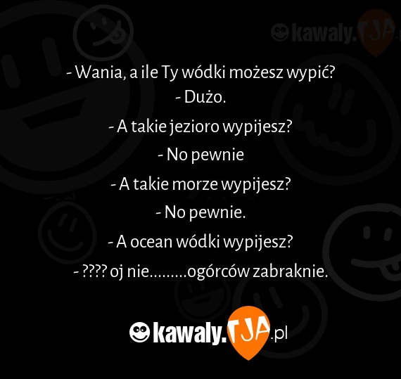 - Wania, a ile Ty wodki mozesz wypic? - Duzo. - A takie jezioro wypijesz? - No pewnie - A takie morze wypijesz? - No pewnie. - A ocean wodki wypijesz? - ???? oj nie.........ogorcow zabraknie.