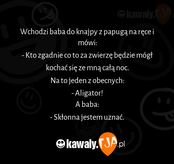 Wchodzi baba do knajpy z papuga na rece i mowi: - Kto zgadnie co to za zwierze bedzie mogl kochac sie ze mna cala noc. Na to jeden z obecnych: - Aligator! A baba: - Sklonna jestem uznac.